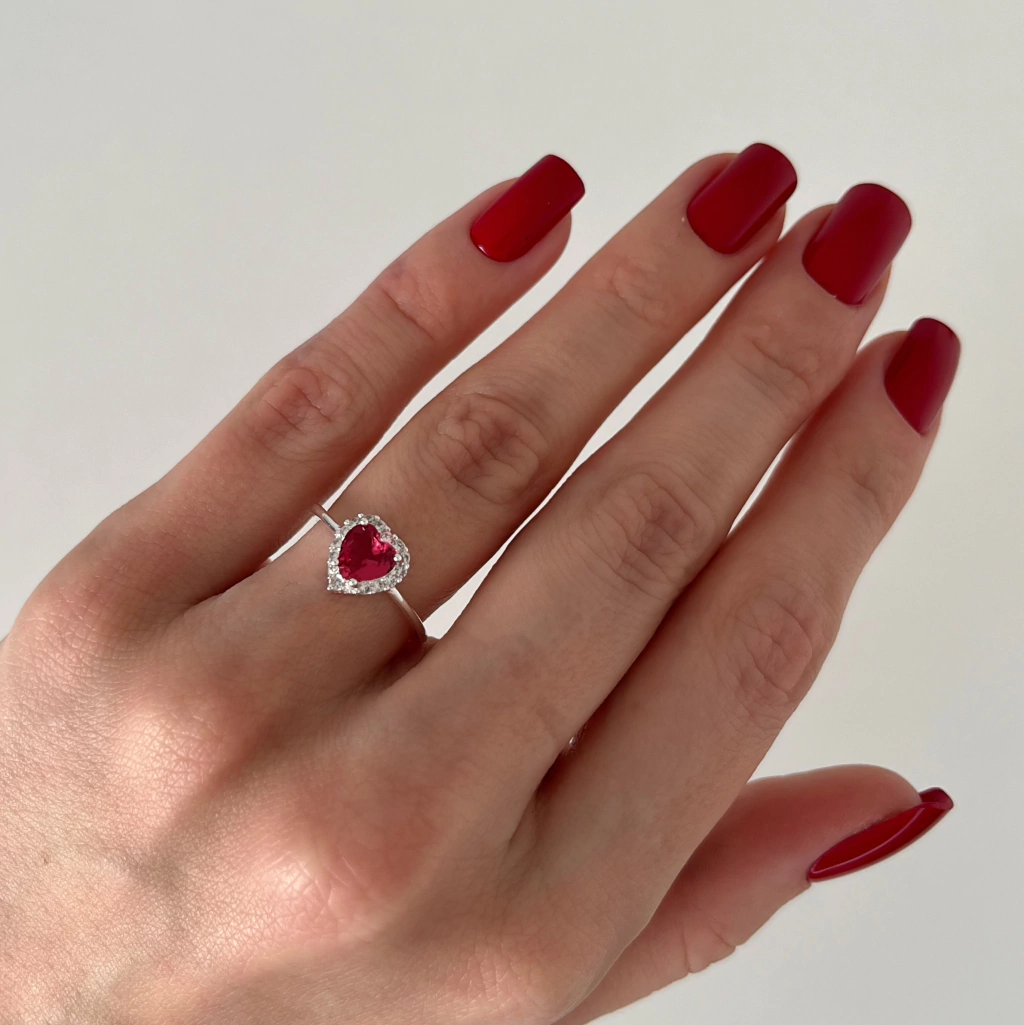 Modelo: Anel de Prata Solitário Coração Vermelho Cravejado Brilhante