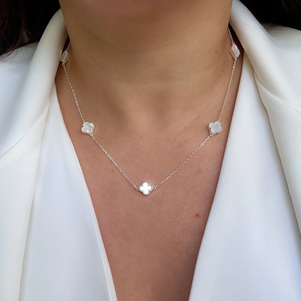 A Choker de Prata 5 Trevos Madrepérola é uma joia delicada e encantadora, perfeita para quem busca elegância com um toque de leveza. Os 5 pingentes em formato de trevo com detalhes em madrepérola trazem um significado de sorte e proteção, enquanto o design ajustável proporciona conforto e versatilidade.