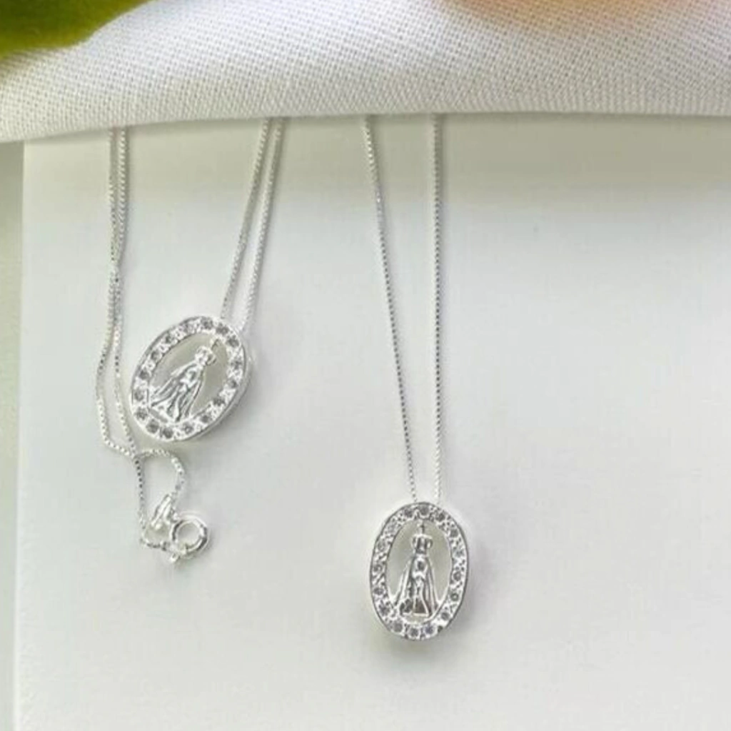 O Colar de Prata Pingente Nossa Senhora Aparecida Cravejado é uma joia que une fé e sofisticação. O pingente de 17mm traz a imagem da padroeira do Brasil em um design delicado, com detalhes cravejados que proporcionam um brilho especial e encantador.