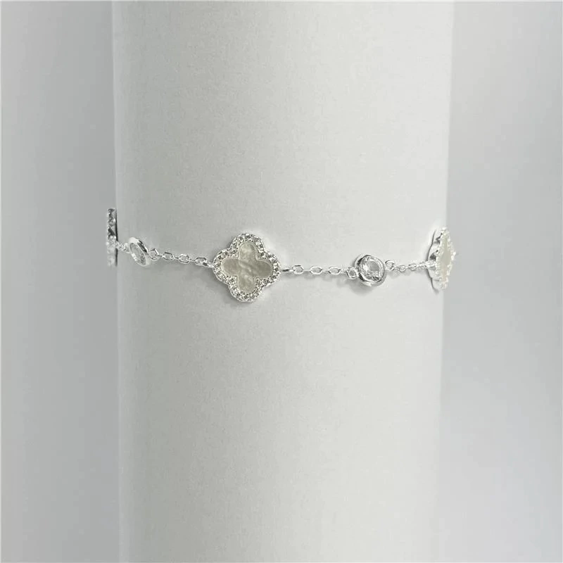 A Pulseira de Prata 3 Trevos Madrepérola e Ponto de Luz combina delicadeza e brilho em uma só peça. Os trevos de madrepérola representam sorte e beleza natural, enquanto os pontos de luz garantem um toque extra de sofisticação. Ideal para quem busca uma joia elegante e cheia de significado.