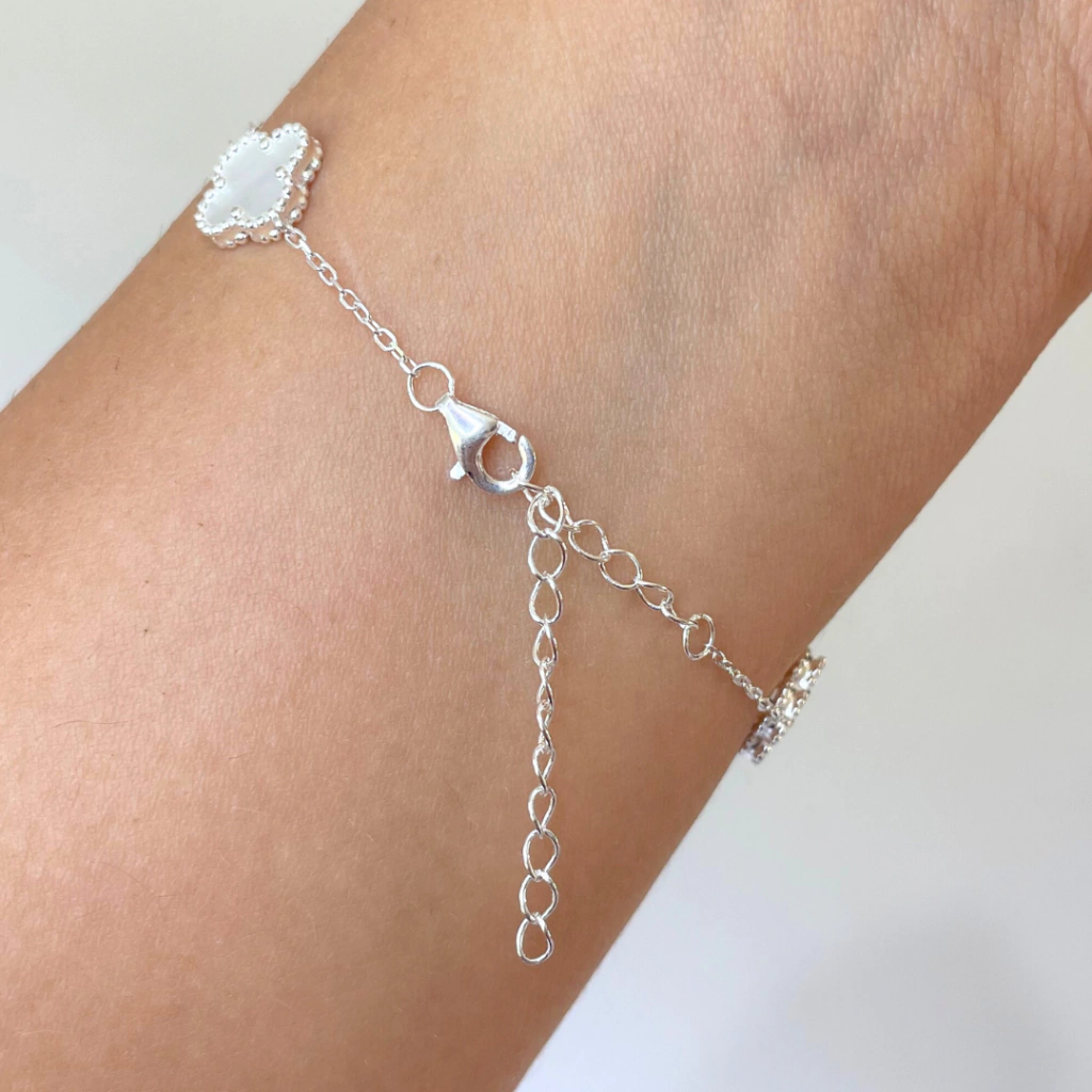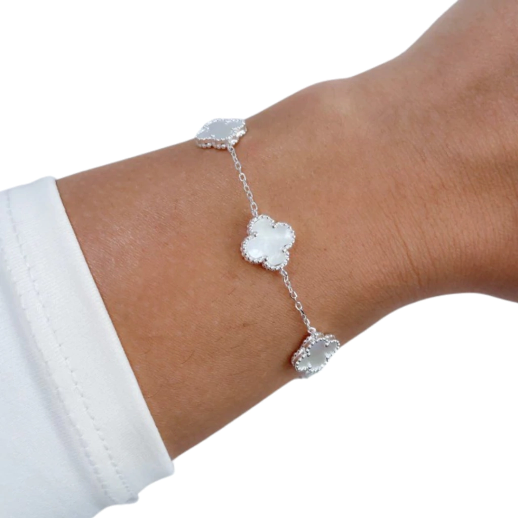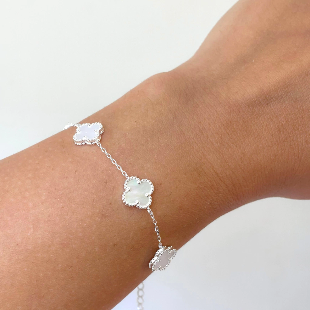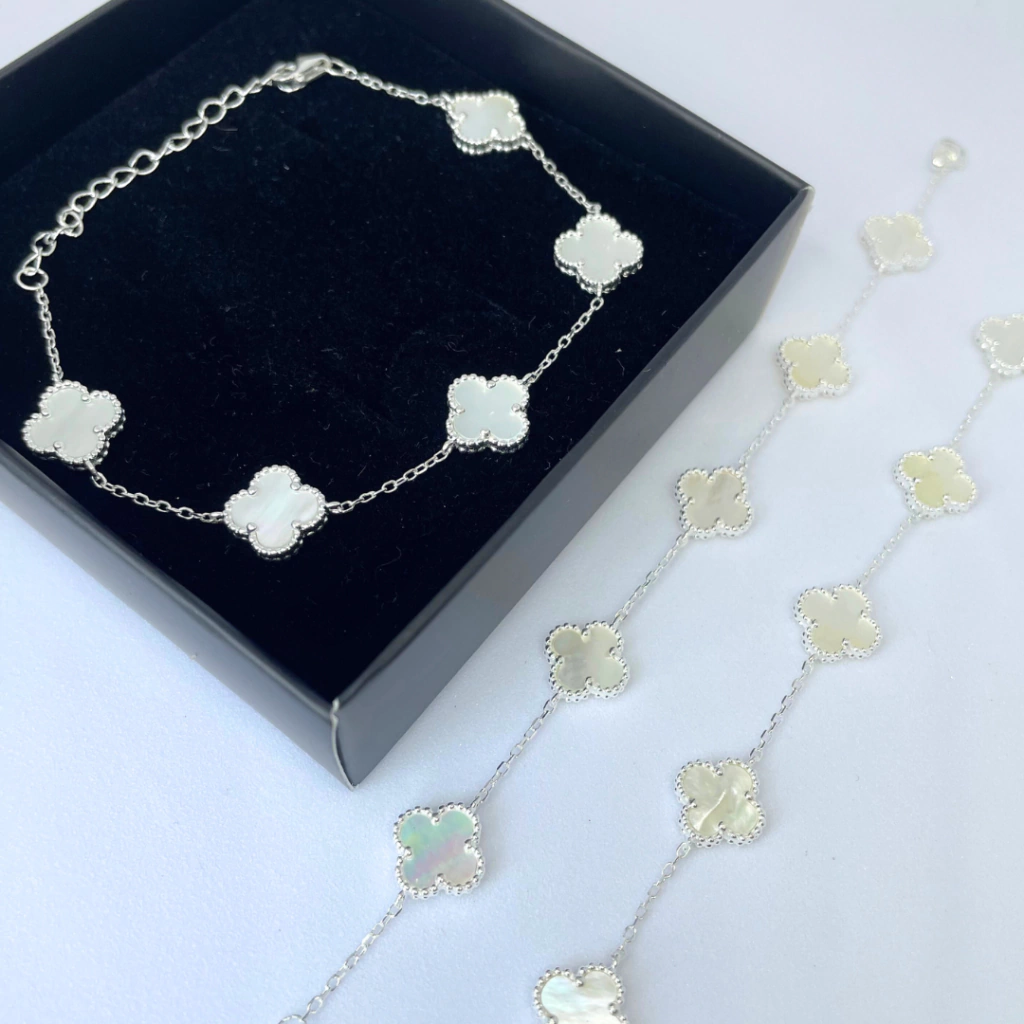 A Pulseira de Prata 5 Trevos Madrepérola - 1cm é uma peça delicada e cheia de significado. Com cinco lindos pingentes de trevo em madrepérola, essa joia simboliza sorte, proteção e sofisticação, sendo perfeita para quem ama acessórios elegantes e atemporais.