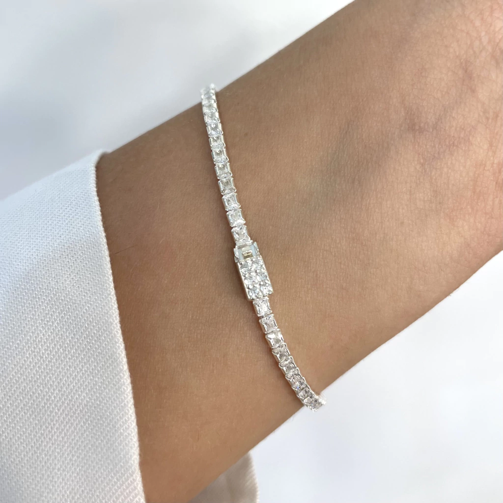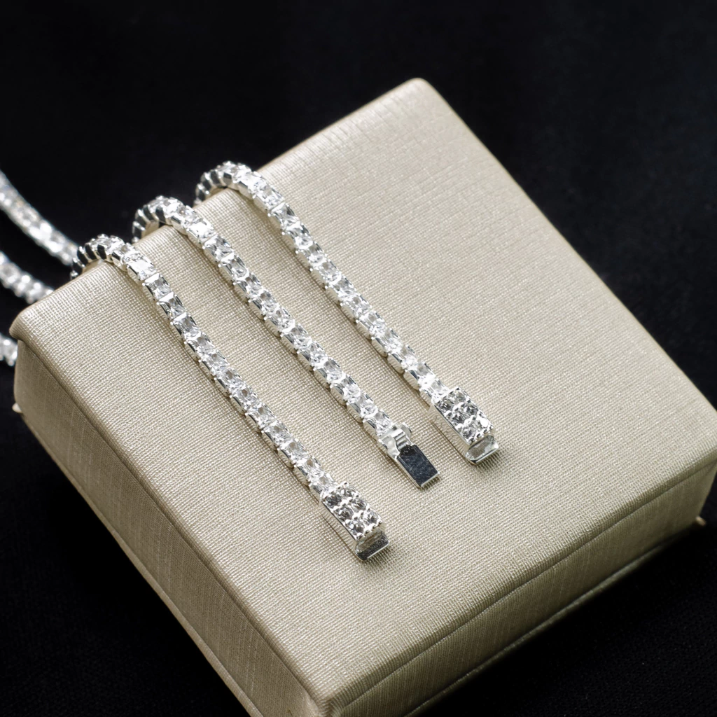 A Pulseira de Prata Riviera Quadrada é uma peça sofisticada que combina estilo e elegância. Fabricada em Prata 925 legítima, esta pulseira apresenta elos quadrados com 3mm de espessura, oferecendo um brilho sutil e um design moderno que se destaca em qualquer ocasião.