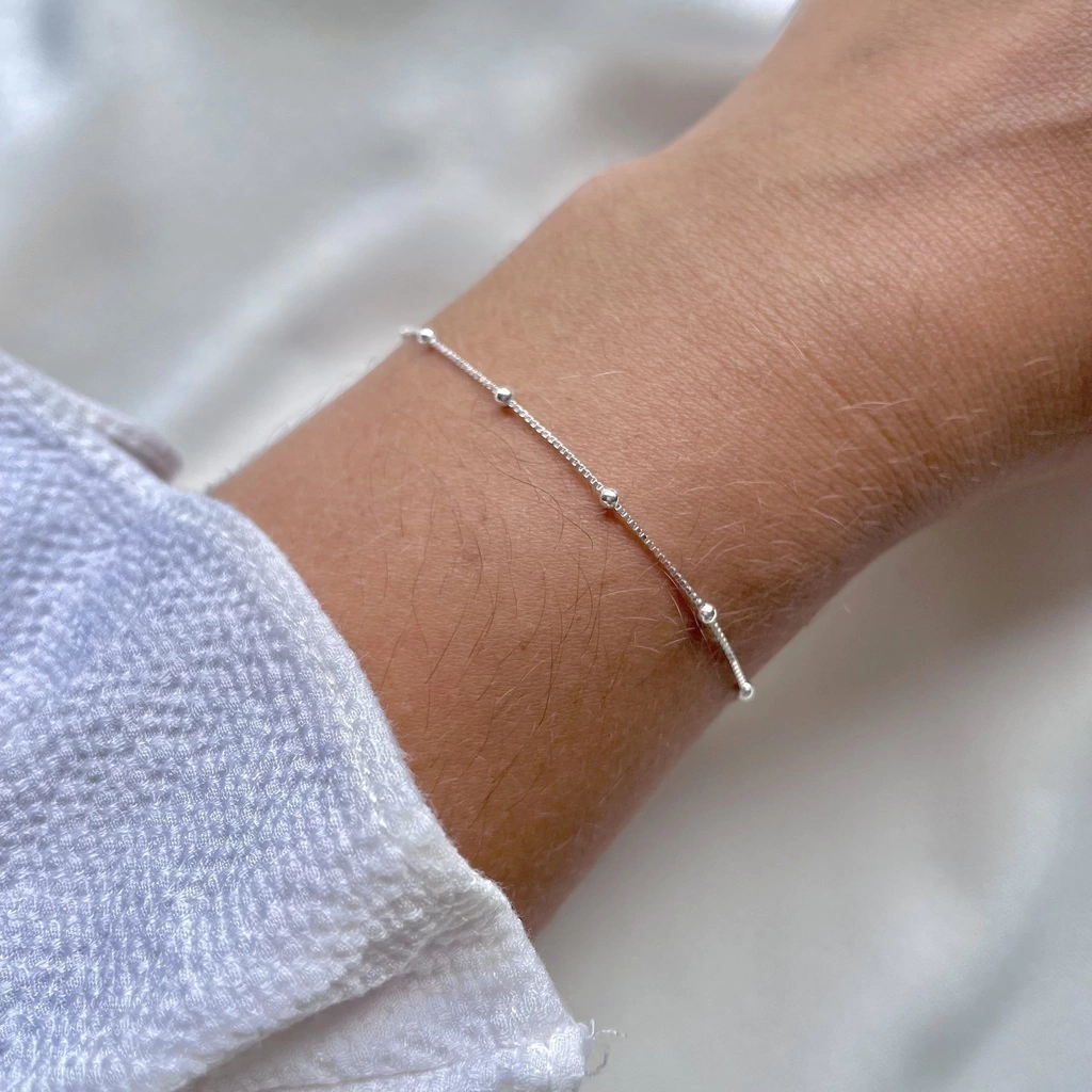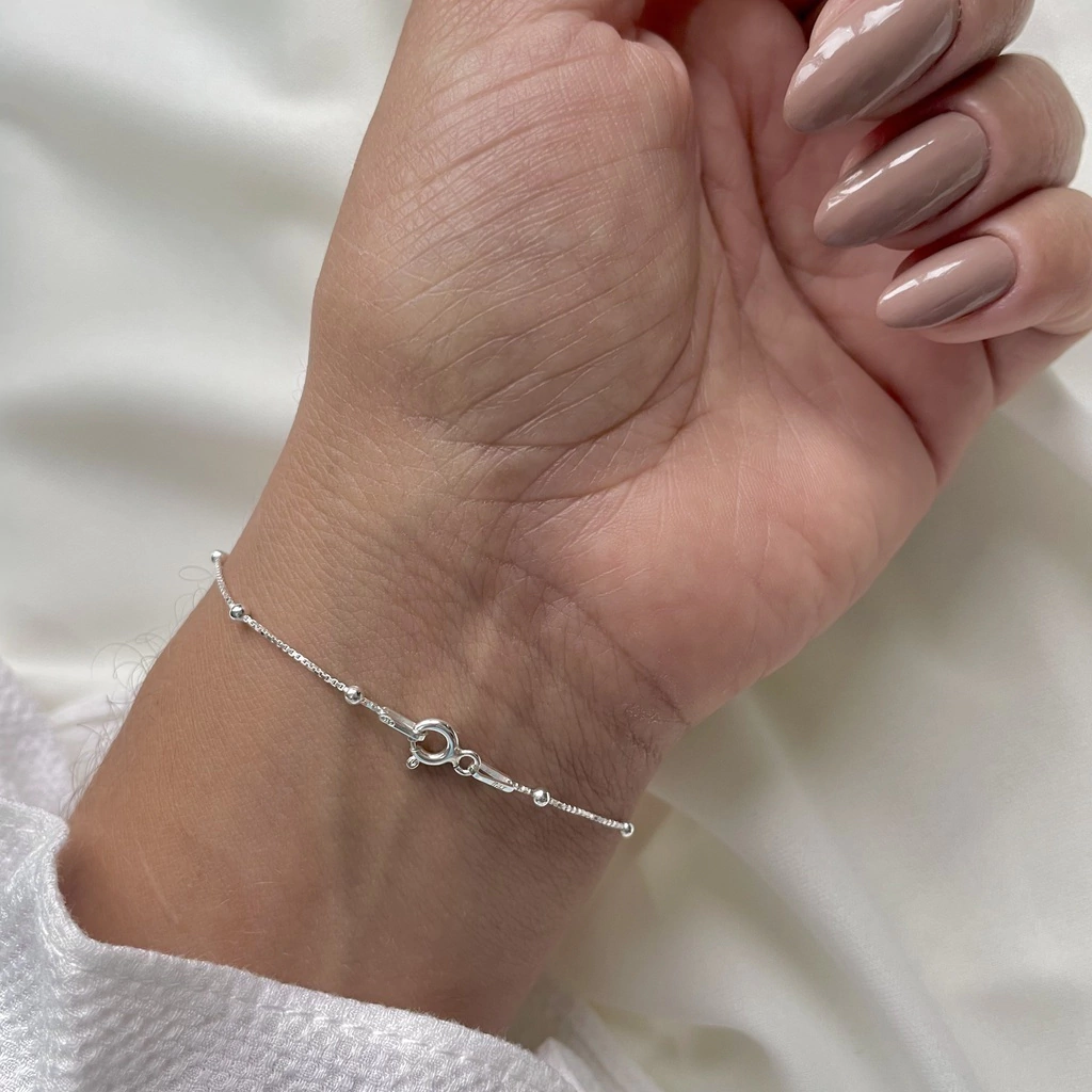 Descubra a delicadeza encantadora da nossa Pulseira Veneziana com Bolinhas em Prata 925. Criada para mulheres que apreciam o estilo sofisticado, esta pulseira apresenta um design elegante com uma corrente veneziana de 1mm de espessura e pequenas bolinhas de 2mm. Com um tamanho de 18cm, esta pulseira é perfeita para complementar qualquer visual com um toque de brilho e charme. Ideal para uso diário ou ocasiões especiais, esta pulseira em Prata 925 adiciona uma dose de elegância e feminilidade ao seu guarda-roupa.